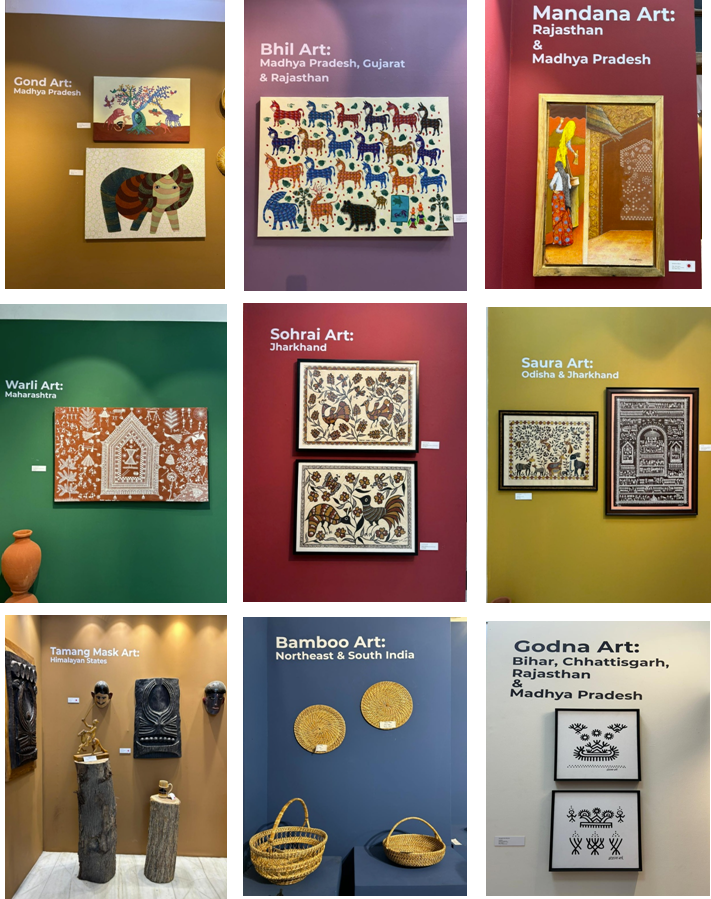 The exhibition presented a vibrant spectrum of tribal artistic traditions from across India. It included Warli from Maharashtra, Gond from Madhya Pradesh, Bhil from Madhya Pradesh, Rajasthan and Gujarat, Dokra metal craft from West Bengal, Chhattisgarh and Odisha, Sohrai from Jharkhand, Koya art from Telangana and Andhra Pradesh, Kurumba art from Tamil Nadu, Saura painting from Odisha, Bodo art from Assam and the North-East, and Oraon art from Jharkhand and Chhattisgarh. The festival also featured Mandana from Rajasthan and Madhya Pradesh, Godna from Bihar, Madhya Pradesh and Chhattisgarh, bamboo crafts from the North-East, and several other indigenous traditions. Together, it reflected India’s remarkable regional diversity and a shared civilisational continuity rooted in nature, ritual and collective memory.