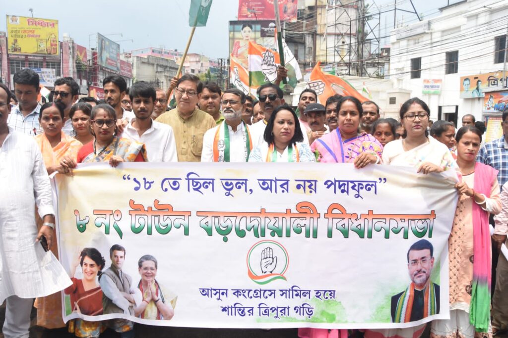 Tripura Pradesh Congress campaigned for Town Bordowali-8 Assembly constituency by-election at Agartala on Sunday (29th May, 2022). All India Congress Committee (AICC) Secretary Szarita Laitphlang, Tripura Pradesh Congress President Birajit Sinha, Ashish Kumar Saha, Tripura Pradesh NSUI President Samrat Roy and other congress leaders were present at the rally.