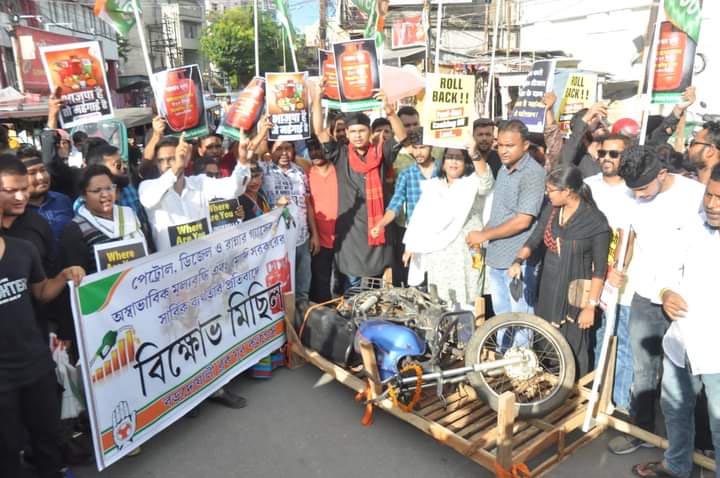 Tripura Pradesh Youth Congress activists protested rally against the price hike of Petrol, Diesel, LPG and other essential commodities in Agartala on Monday (8th August, 2022). All India Congress Committee (AICC) Secretary Szarita Laitphlang and other Youth congress leaders were present.
