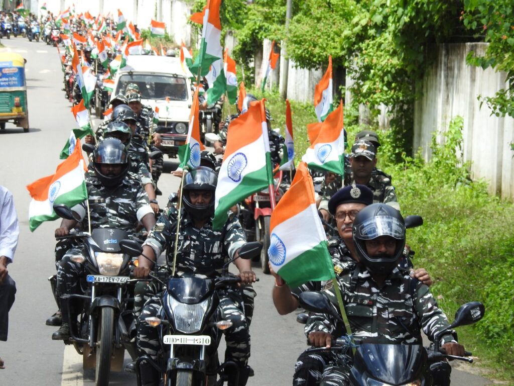 To promote “Har Ghar Tiranga” campaign of the Government, Tripura Sector CRPF took out a bike rally from Salbagan, Headquarters 124 Bn under the leadership of Vijay Kumar, DIG, Tripura Sector, CRPF. The bike rally with the National Flag passed through the streets of Salbagan, Lichubagan, Nutan Bazar, Usha Bazar, Narsingarh and Gandhigram. Among others who participated in the rally were B B Sethi, DIG Range Agartala, Mukesh Tyagi, Commandant 124 Bn CRPF, Officers and personnel from D/3rd Signal, 71 Bn, 124 BN, Range Agartala and Tripura Sector Headquarters, CRPF. The idea behind the rally is to invoke the feeling of patriotism in the hearts of the people and to promote awareness about the Indian National Flag. Apart from the bike rally, 600 flags were distributed to students of Sukhamoy High School, Usha Bazar, shops and among the local public of Usha Bazar. The local people have appreciated this patriotic march of nationalism.