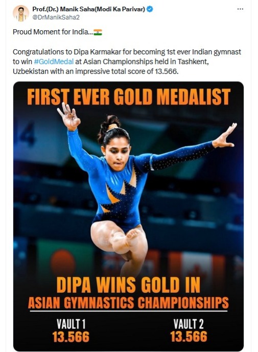 “Proud Moment for India… Congratulations to Dipa Karmakar for becoming 1st ever Indian gymnast to win #GoldMedal at Asian Championships held in Tashkent, Uzbekistan with an impressive total score of 13.566.”, Hon’ble Chief Minister Dr. Manik Saha tweeted.