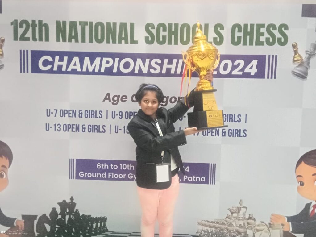 The Little Chess master Aaradhya Das D/O- Anuj Kumar Das, resident of Shibnagar, Agartala, Tripura had won bronze, certificate and cash prize in 11 category at 12th edition of National Schools Chess Championship 2024. Aaradhya Das is a student of Sri Krishna Mission School, Agartala.