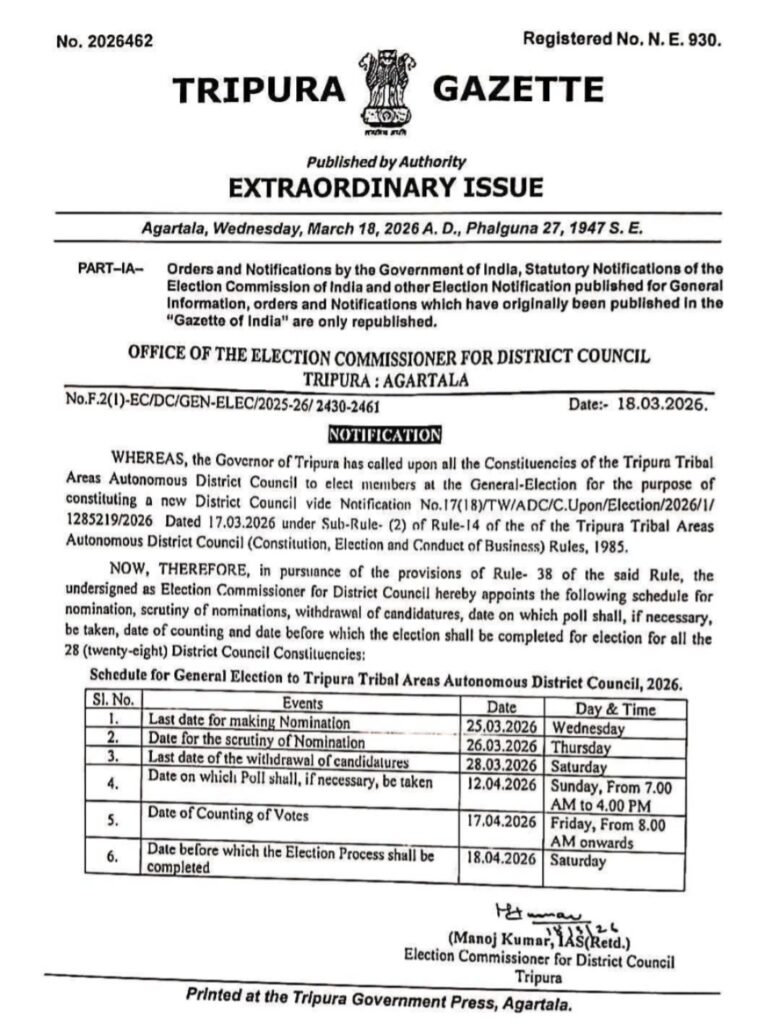 Agartala, Tripura, 18th of March, 2026 : The Election Commissioner For District Council of Tripura statement – “the Governor of Tripura has called upon all the Constituencies of the Tripura Tribal Areas Autonomous District Council to elect members at the General-Election for the purpose of constituting a new District Council vide Notification No.17(18)/TW/ADC/C.Upon/Elcction/2026/1/1285219/2026 Dated 17.03.2026 under Sub-Rule- (2) of Rule-14 of the of the Tripura Tribal Areas Autonomous District Council (Constitution, Election and Conduct of Business) Rules, 1985.”