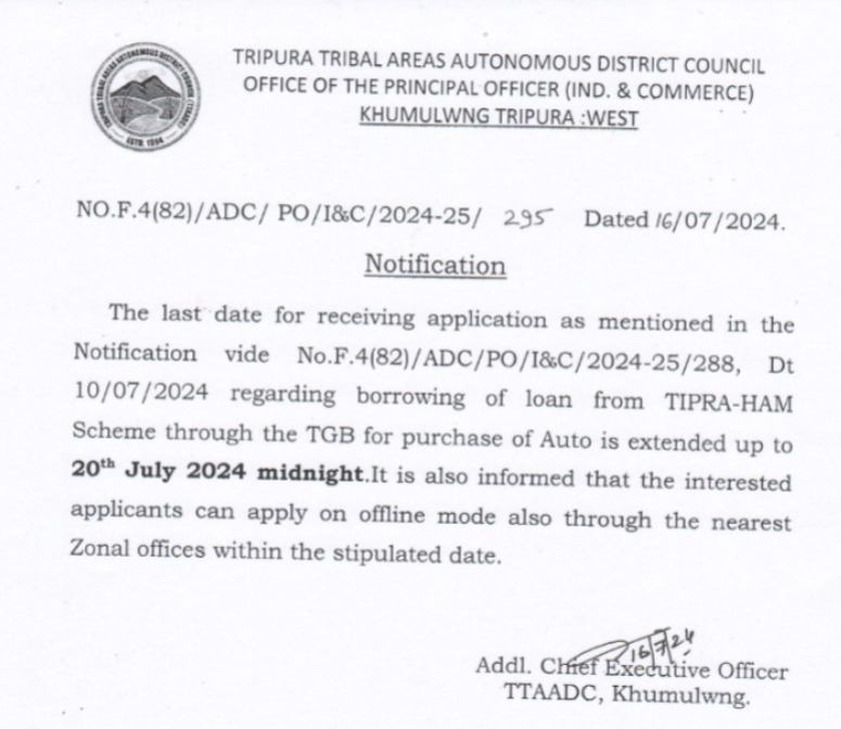 Agartala, 17th of July, 2024 : Tripura Tribal Areas Autonomous District Council released a memorandum that, “The last date for receiving application as mentioned in the Notification vide No.F.4(82)/ADC/PO/I&C/2024-25/288, Dt 10/07/2024 regarding borrowing of loan from TIPRA-HAM Scheme through the TGB for purchase of Auto is extended up to 20th July 2024 midnight. It is also informed that the interested applicants can apply on offline mode also through the nearest Zonal offices within the stipulated date.”