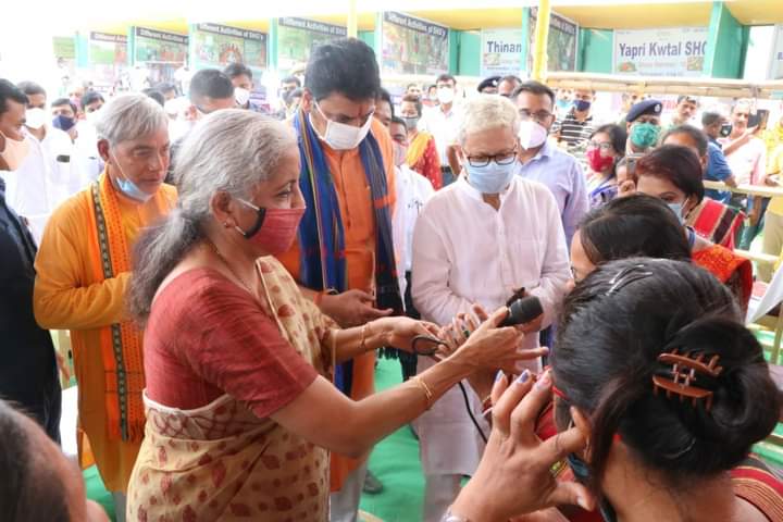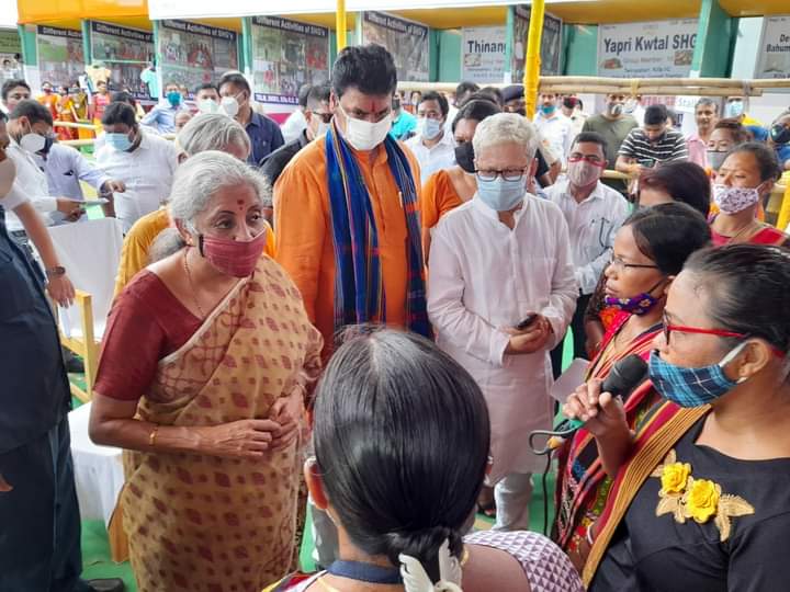 Hon’ble Finance and Corporate Affairs Minister of India Nirmala Sitharaman on today (28th August, 2021) interacted with women Self Help Groups (SHG) members at Dashrath Deb Memorial School Ground in Gomati along with Hon’ble Chief Minister Biplab Kumar Deb, Hon’ble Deputy Chief Minister Jishnu Dev Varma and MLA Rampada Jamatia.
