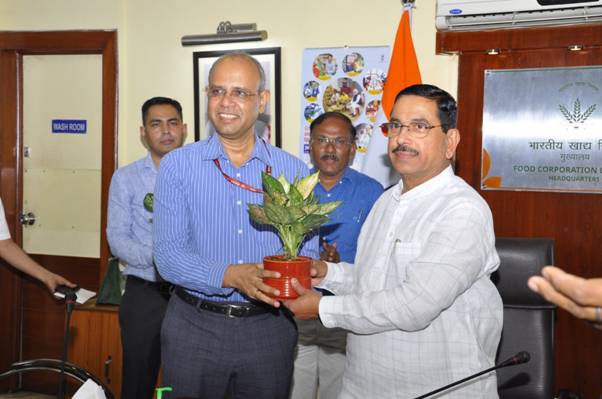 During his visit, the Union Minister interacted with the Chairman and Managing Director (CMD), all Executive Directors, Chief General Managers (CGMs), and General Managers (GMs) of FCI.