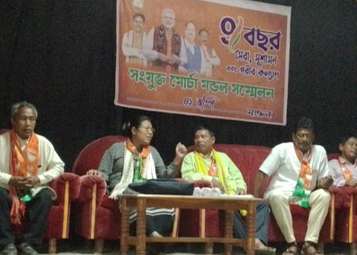 Aiming to strengthen the saffron organization in Ampinagar the BJP organization conducted United Morcha Mandal Conference here in Ampinagar town hall today. All the 7 morcha mandal presidents were invited to take part in the conference. To create the saffron organization more stronger for the upcoming Loksabha election TRPC chairman PK Jamatia has addressed the warriors and said that morcha mandal presidents have very important responsibilities to make the organization stronger and they must maintain good relationship with the common people. She said that the numerous beneficial schemes that have been initiated for the development of the common people are unknown still amidst the rural villagers. She advised the morcha mandal presidents to convince rural villagers to avail the benefit of those schemes.