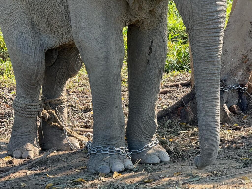 The rescued elephants include individuals like Laxmi, a 10-year-old captive-born sub-adult who struggles to bear weight on her hind legs due to deep, untreated wounds and suffers from a fresh, painful 1-inch diameter hole piercing her sensitive right ear pinna—both inflicted during the brutal taming process to establish human dominance. Maya, a 2-year-old captive-born calf, was rescued alongside her mother, Rongmoti, who endured large harness-induced lesions on her chest and buttocks from prolonged logging work. Ramu, a bull elephant, was found heavily restrained with both his forelegs and hindlegs tightly tethered together to control his 4–6 month musth period, resulting in immense physical and psychological distress. Babulal, another bull elephant, suffered from a severely broken and bleeding tail, caused by a conflict with a wild bull elephant during foraging. Years of captivity had stripped him of the natural instincts needed to defend himself.