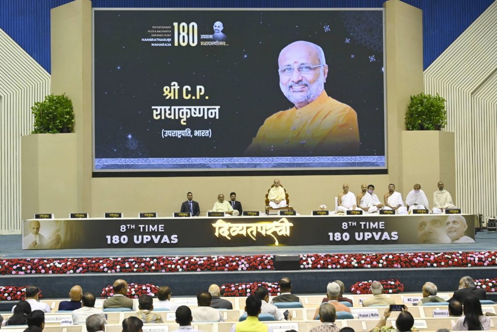 New Delhi, Delhi, 8th of November, 2025 : The Vice-President of India, Shri C. P. Radhakrishnan, graced the Eighth 180 Upvas Parna Ceremony of Jain Acharya Shri Hansratna Surishwarji Maharaj Ji at Vigyan Bhavan, New Delhi, today.