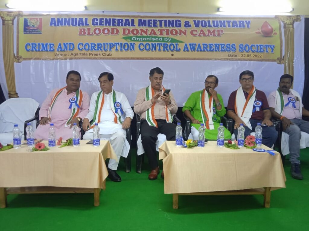 Crime and Corruption Control Awareness Society has organized Voluntary Blood Donation Camp on the occasion of Annual General Conference at Agartala Press Club on Sunday (22nd May, 2022). Hon’ble Mayor of Agartala Municipal Corporation (AMC) Dipak Majumder, DSP of Crime Branch Ajoy Kumar Das, Chairman Handloom & Handicraft Development Corporation Ltd. Balai Goswami, State President CCCAS Shubhrangsu Paul and other dignitaries were present at the conference.