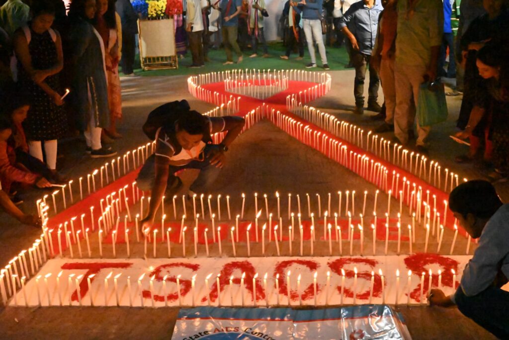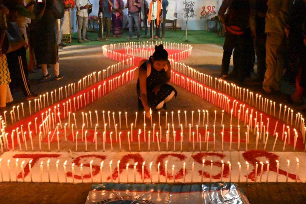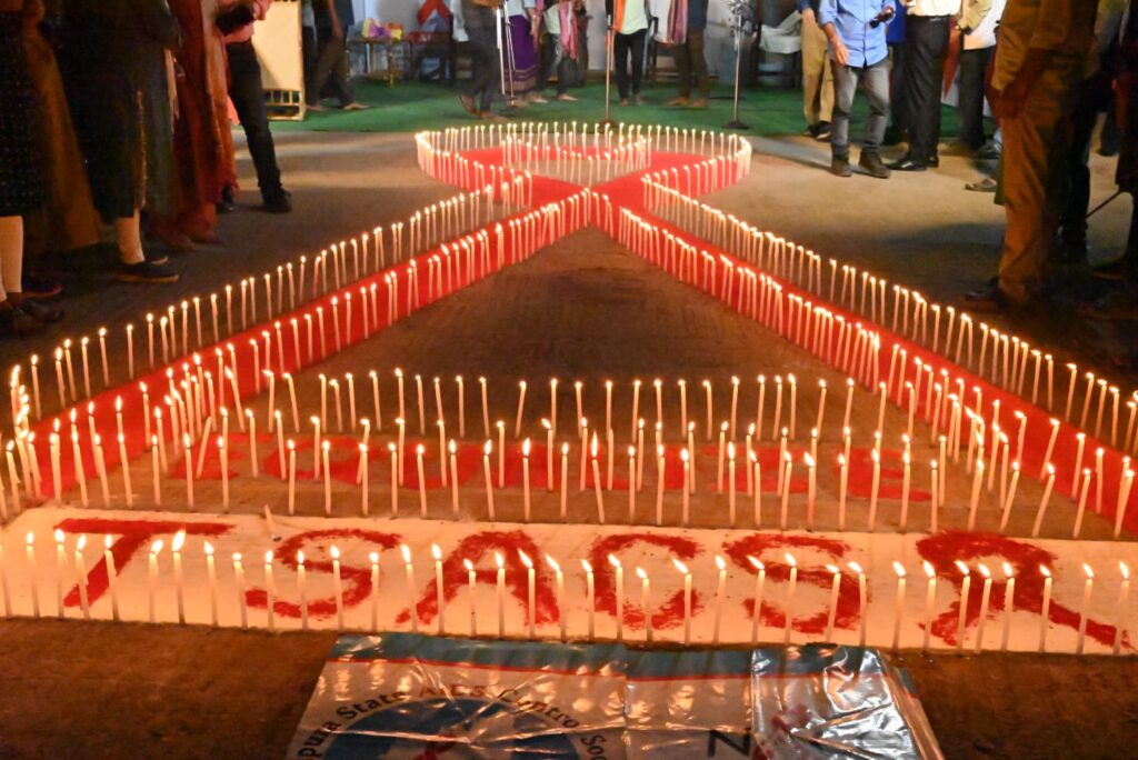 Volunteers light candles making a formation of the red ribbon used to spread awareness and extend solidarity towards people living with AIDS on the eve of World AIDS Day in Agartala on Wednesday, (30th November, 2022).