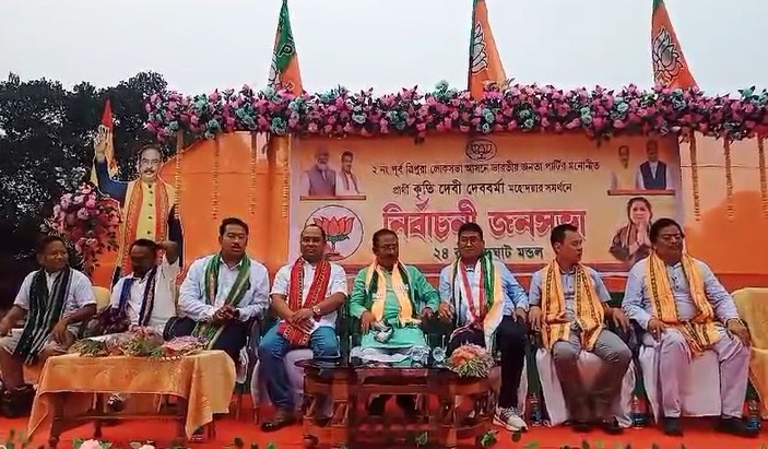 Khowai, 11th April, 2024 : With the initiative of Khowai Mandal Bharatiya Janata Party and Tipraha Indigenous Progressive Regional Alliance (TIPRA) Motha Party conducted rally at Gouranga Tilla under Ramchandraghat Assembly constituency on Thursday (11th April, 2024). Aiming to upcoming Lok Sabha elections, BJP and TIPRA Motha conducted rally in support candidate of Tripura East Parliamentary Constituency Kriti Singh Debbarma.