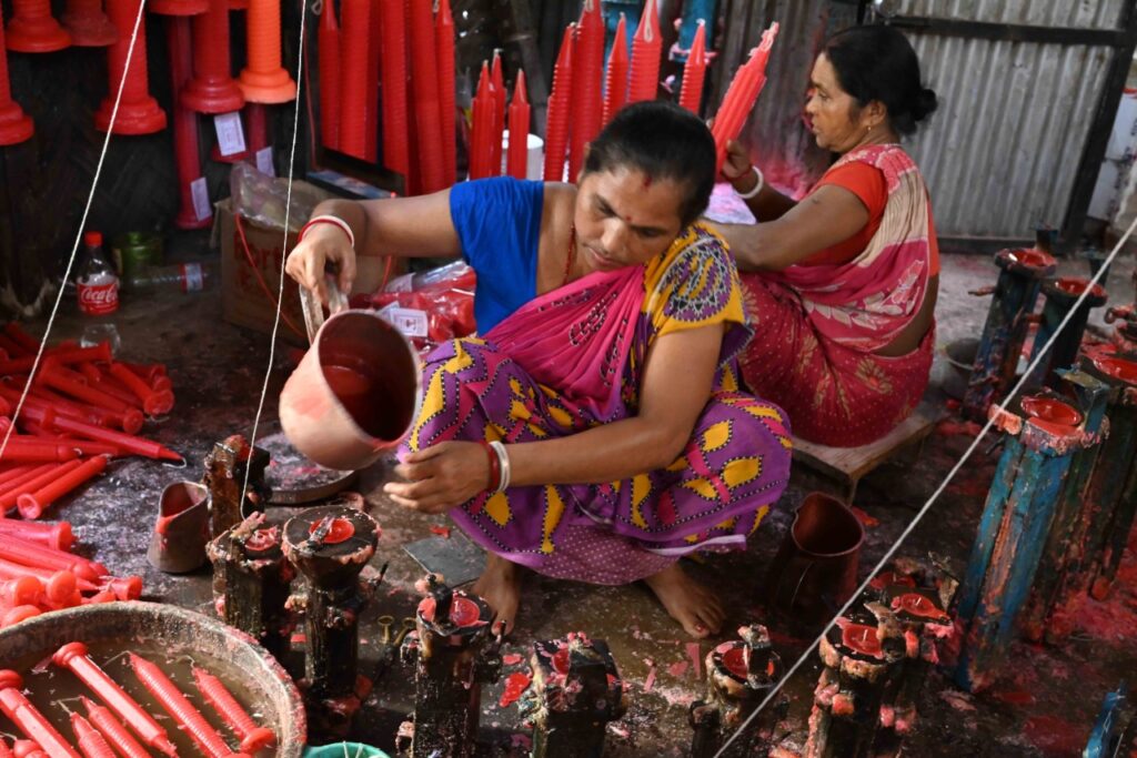 Women workers prepare colourful candles for sale ahead of the Diwali festival in Agartala on Friday (14th October, 2022).