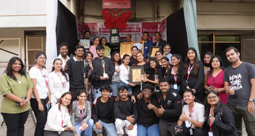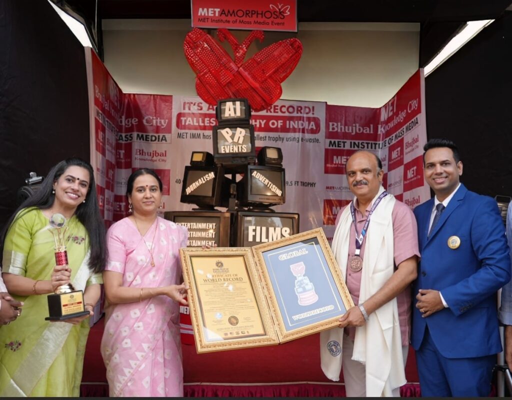 The Certificate of World Record was formally presented at the MET Bandra Campus by Mr. Shrikant Kale, Secretary of the Global Book of Excellence, England. The recognition was received by Hon. Trustee Shri Pankaj Bhujbal. In preparation for METamorphosis 2025, the institute’s flagship annual media festival scheduled from December 11 to 13, students designed and built an impressive 9.5-foot-tall trophy weighing 350 kilograms, crafted entirely from e-waste and eco-friendly materials.
